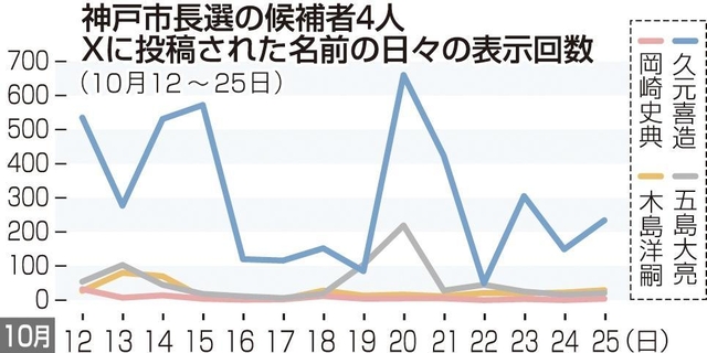 1日ごとの表示回数を見ると、久元氏は乱高下しており、自己最多は20日の約700回。同日、久元氏の支持を公言している神戸市議が自身のXのアカウントに、8年前の議会の質疑で子ども医療費の無料化を巡る共産党市議の質問に対して久元氏が反論する場面の動画を投稿し、拡散されたことが影響したとみられる。