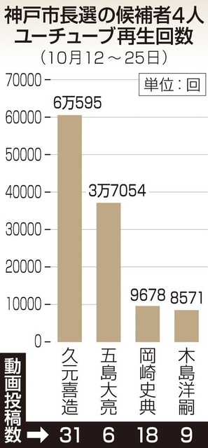 立候補した4人の総再生回数は計約11万5900回だった。久元氏は約6万600回でトップに立った。2番目の五島氏は約3万7100回で、久元氏と五島氏の2人で全体の約8割に及んだ。岡崎氏は約9700回、木島氏は約8600回だった。