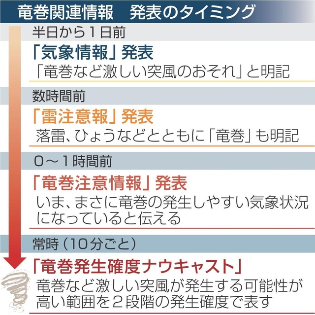 同庁は、静岡県に5日朝から繰り返し「竜巻注意情報」を発表し、対策を呼びかけたが、被害は防げなかった。この情報は大気の安定度や気象レーダー観測からはじき出した「突風危険指数」などを基に発表。積乱雲に伴う強い上昇気流で激しい渦巻きが起こる竜巻だけでなく、積乱雲から強い気流が吹き下ろす「ダウンバースト」や、冷暖の空気が衝突して起こる「ガストフロント」も対象で、1時間先までの激しい突風に注意を促す。