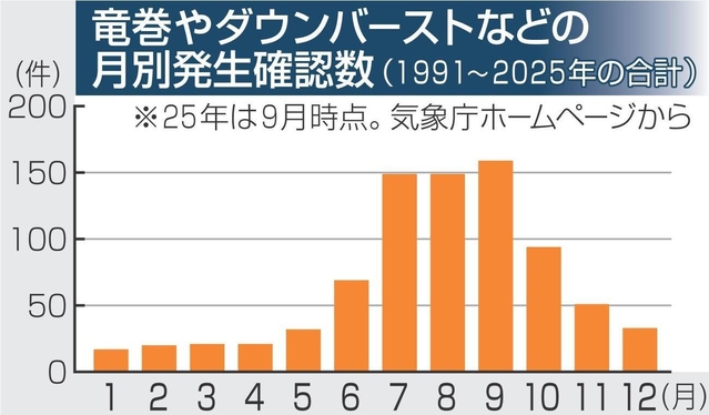 1991年1月~2025年9月までの突風発生確認数は全国で815件。7~10月が94~159件と多いが、11月は51件、12月も33件あった。晩秋から冬にかけても油断はできない。
