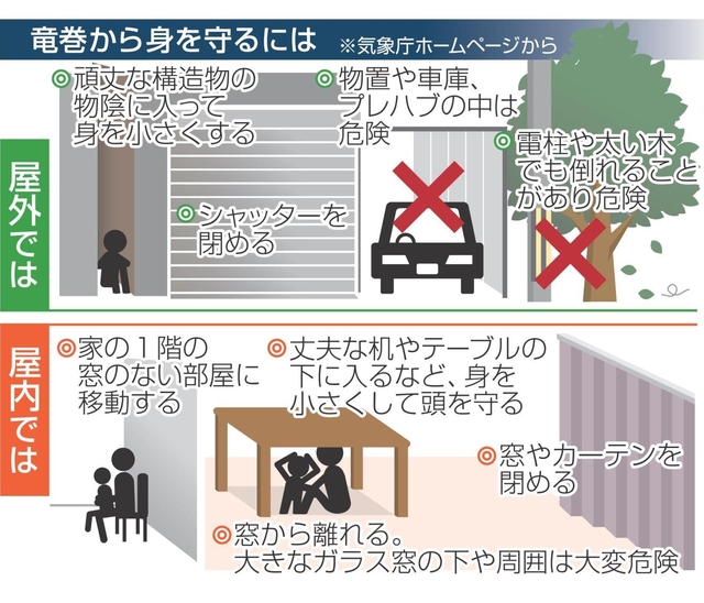 通常、突風の被害範囲は狭く、情報が出たからといって必ず遭遇するわけではない。同庁によると、空が突然暗くなる▽冷たい空気が流れる▽ひょうが降る▽雷が鳴る-といった前兆がある場合は、早急に頑丈な建物に避難する必要がある。車やプレハブの中にいても危険で、屋内では窓のない1階の部屋に移動するなどの対応が急がれる。