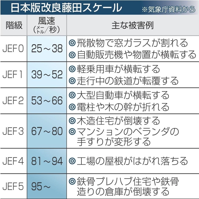 この竜巻は、強さを分類する「日本版改良藤田スケール」で6段階のうち上から3番目の「JEF3」に該当。気象庁が同スケールを導入した2016年以降で最強クラスとなった。