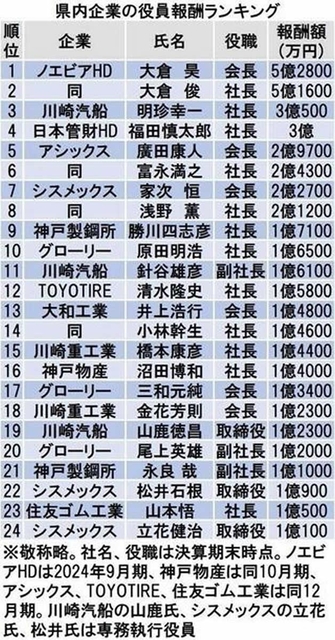 ■報酬1億円以上の役員24人、過去最多に並ぶ 24年度、兵庫県内上場企業(7月9日)