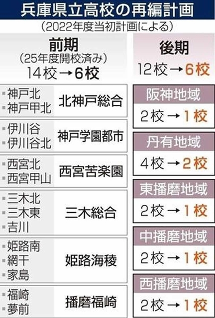 兵庫県教育委員会が前後期の2回に分けて計画している県立高校の再編統合で、2028年春に開校を予定していた後期計画の延期を決めたことが4日、県教委への取材で分かった。当初は25年度中に対象12校を公表する予定だったが……続きはこちら