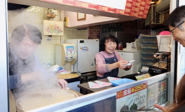 12時19分 開店時から並んでいた明石市の会社員、秋山卓哉さん(48)が妻と一緒に3品を購入。「子どもの頃、『アイス2個入れて』とか、無理言うたなあ」。カウンター越しに聞きつけた広子さんが「何頼んでたか、よく覚えているよー」と返す。