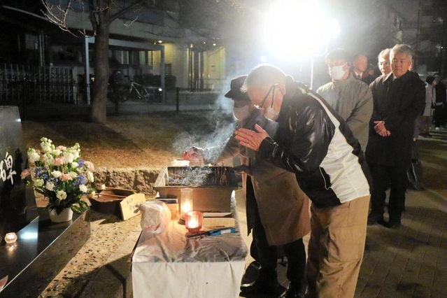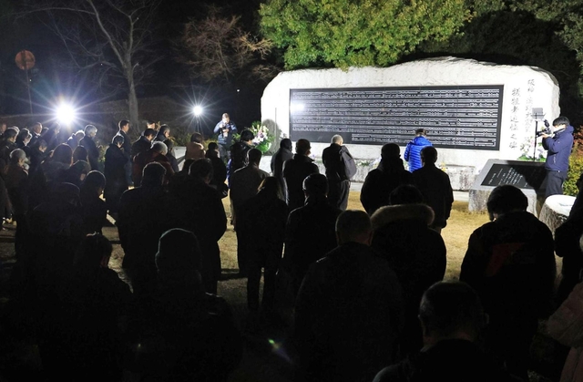 5・10 灘区・琵琶町公園 61人の名前が彫られた慰霊碑に照明が向けられ、「あの刻(とき)を忘れない」の文字が暗がりにくっきりと浮かぶ。地域住民がぽつりぽつりと集まり、約10人が碑を囲んだ。近くに住む中川清司さん(73)は「見違えるほどきれいな街になったからこそ、私たちが復興の過程で経験した苦労などを伝えていかなければいけない」と話した。
