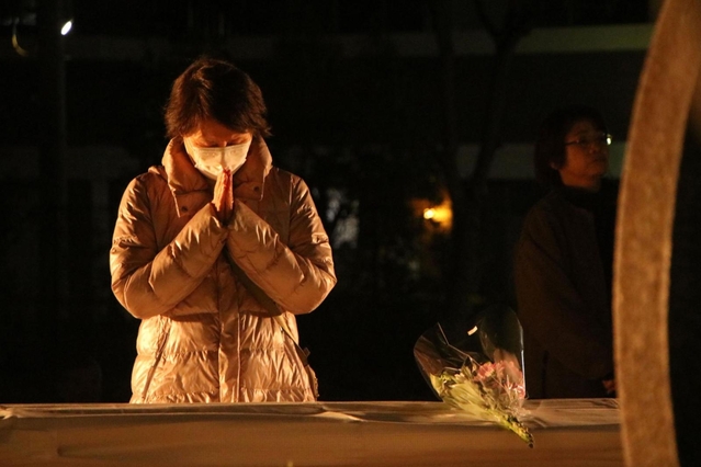 東灘区・本山第一小学校 校庭に静寂が広がる。「黙とうの会」に集った児童や住民ら約200人がろうそくを手に輪をつくり、祈る。会を運営するボーイスカウト神戸第54団の田中佑樹さん(42)は当時、同小6年。あいさつで「毎日震災について考えることはできないが、今日は思いをはせ、地域のつながりを考えたい」と呼びかけた。