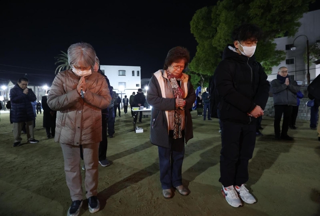 西宮市・西宮震災記念碑公園 市内で亡くなった1086人の名前が刻まれた慰霊碑がライトに照らし出され、集まった人たちが黙とうをささげた。市民サークルの親友を亡くした保育士の宇野妙子さん(83)は「震災さえなければ今もつきあいが続いていたのに。ここに来れば会えたような気持ちになる」と話した。