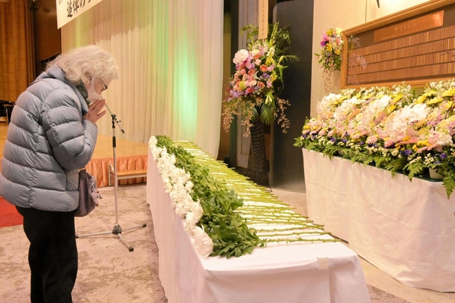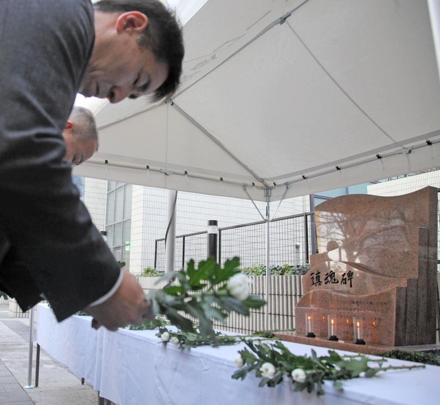 8・30 東灘区・コープこうべ生活文化センター 震災直後、遺体安置所にも使われたセンターには、敷地内に鎮魂碑があり、集まった職員約40人が黙とうした。岩山利久組合長(63)が「1月17日はこれからも特別な日であり続ける」とあいさつ。一人一人が思いを込め、碑に献花した。