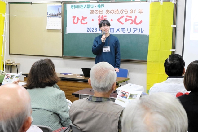10・32 長田区・長田区文化センター 地域の復興について語り合う集会で、高齢者ら約50人の参加者を前に、能登半島地震の被災地、石川県穴水町に移住した関西学院大4年の熊谷朋也さん(22)が現状を報告した。「道路も復旧していない。住民は存在が忘れられることを恐れている」