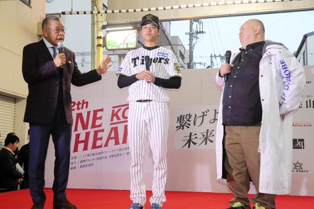 18・07 長田区・西神戸センター街 被災地に元気と笑いを届ける毎年恒例のライブで、プロ野球阪神タイガースOBの掛布雅之さんらが登場し、所狭しと集まった人々が耳を傾ける。実行委員長の田中雅久さん(52)は「震災を機に商店街を去って行った仲間がイベントの盛り上がりを見て、『長田はまだやれるぞ』と地元に戻ってきてくれれば」と力を込めた。