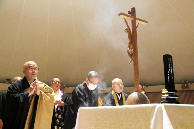 5・32 長田区・カトリックたかとり教会 聖堂に住民や信徒、僧侶らが集い、それぞれの手の中でろうろくの火が細く揺れる。「31年が経過したが、私たちは震災を一生抱えて過ごすことになると思う」と神田裕神父(67)は語りかける。読経にほら貝の音、聖歌が響く。宗教を超えた祈りが重なる。