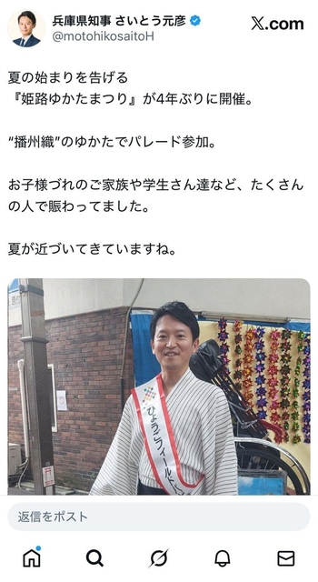 兵庫県知事の斎藤元彦は、西脇市のNPOから提供された播州織の浴衣2種類(黒と白)のどちらが祭りにふさわしいか迷っていた。