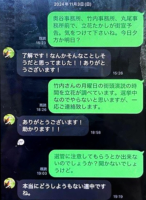 〈竹内事務所前で立花が街宣予告〉〈気をつけてくださいね〉。竹内は丸尾のメッセージを妻に転送し、〈事務所には行かないように〉とだけ書き添えた。