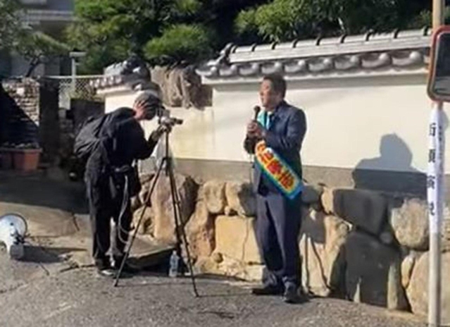 兵庫県議会の百条委員会委員長だった奥谷謙一の自宅兼事務所前で、「NHKから国民を守る党」党首の立花孝志がマイクを握っていた。