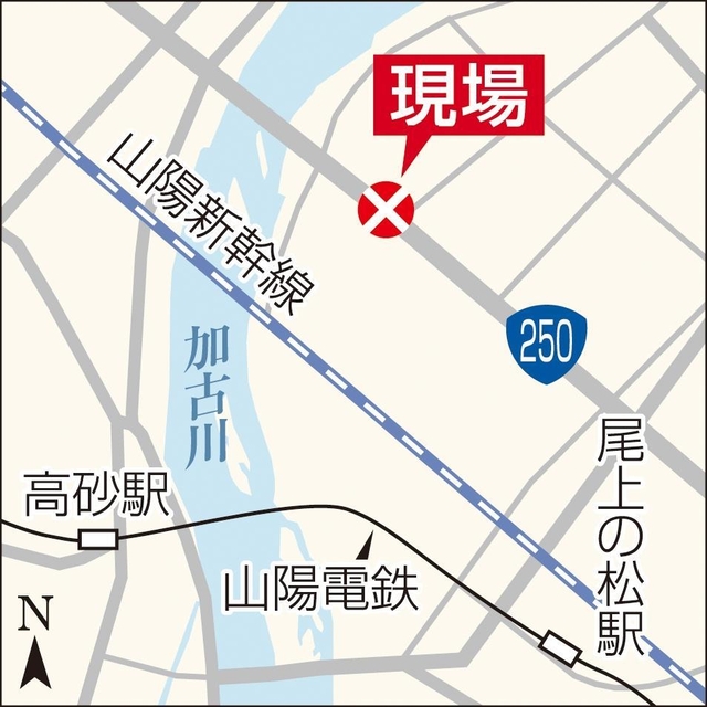 現場はJR加古川駅南西約2・5キロの播州大橋の東詰め付近で、片側3車線の直線道路。姫路バイパスの高砂西ランプ(高砂市)から加古川市を横断して明石市につながる幹線道路。事故は夕方の帰宅時間帯に重なり、周辺に渋滞が発生した。上空にはヘリが飛び交い、多くの住民が心配そうに見守っていた。