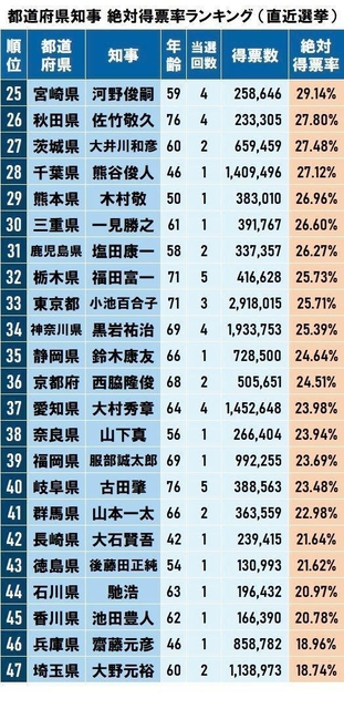全国の都道府県知事47人の直近選挙での絶対得票率をランキングにしたところ、1位は三日月大造滋賀県知事の46・62%、2位は丸山達也島根県知事の46・32%、3位は杉本達治福井県知事の45・27%だった。小池氏は25・71%の33位だった。
