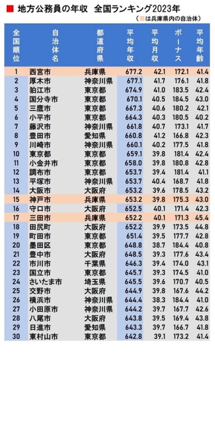 神戸新聞社は、国が行う「地方公務員給与実態調査」のデータを基に、全国の地方公務員の年収ランキング(2023年)を作成した。都道府県や市区町村に勤める一般行政職が対象で、全国トップは兵庫県西宮市の677・2万円、最下位は新潟県粟島浦村の402・2万円だった。兵庫県内からは5市がトップ100に入った。