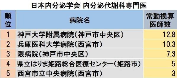 日本内分泌学会は全国3809人(兵庫県164人)の内分泌代謝科専門医を公表している。兵庫県内では、32病院の内科や小児科などに70・8人(常勤換算)が在籍している。