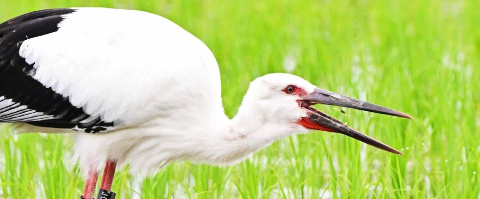 若草色の苗が植わった水田に、コウノトリの幼鳥が舞い降りた。餌を探して、くちばしをしきりに田んぼに突っ込む。オタマジャクシや水生昆虫をくちばしの先端部分で捕まえては、空中に獲物を放るように大きく口を開け、器用にのみ込んだ。