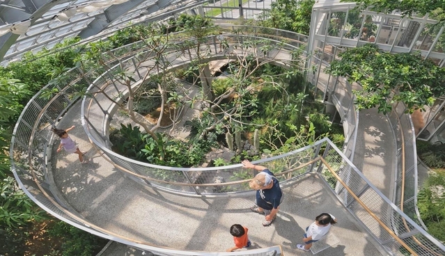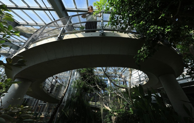 まるで小さな惑星だ。見上げれば、木々の緑が秋の青空に映える。植物約100種が育つ温室「グラスハウス」。中を縫うように延びる円形の回廊(直径約8メートル)からは、生命の息吹を物語るようなダイナミズムを感じる。光に満ちた回廊を歩く家族連れやカップルたち。木の葉に触れながら、自然と笑みがこぼれる。