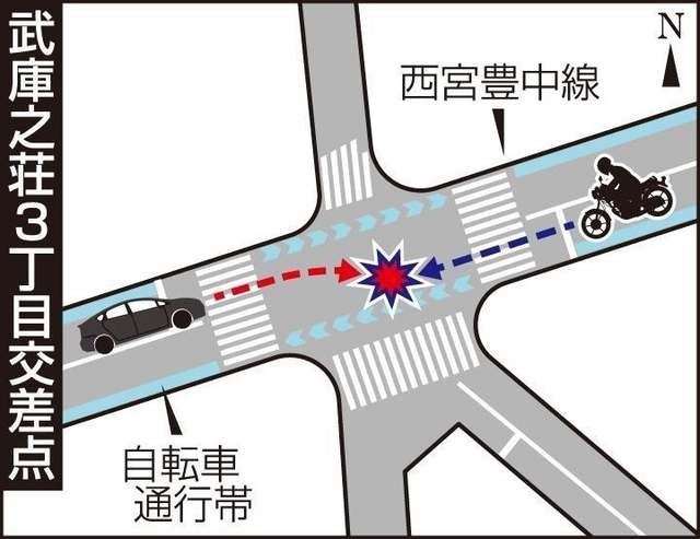県道を東進中の車両が、武庫之荘駅方面に右折しようとして対向車と衝突する事故が相次いでいる。駅方面に向かう市道は、東西の県道に対して斜めに接続しており、スピードを落とさなくても右折しやすいことから、対向車両との事故につながっているとみられる。車体が小さなバイクは距離感がつかみづらく、対向車線で見かけたら注意して運転してもらいたい。