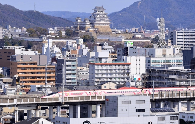 JR姫路駅から麓まで徒歩で20分ほど。坂道を上ると、標高49メートルの小さな山とは思えないほど視界が一気に開けた。北側には、約500メートル先に新幹線が東西に走る。その向こうでは白く浮かぶ世界遺産・国宝姫路城が街を見守っている。
