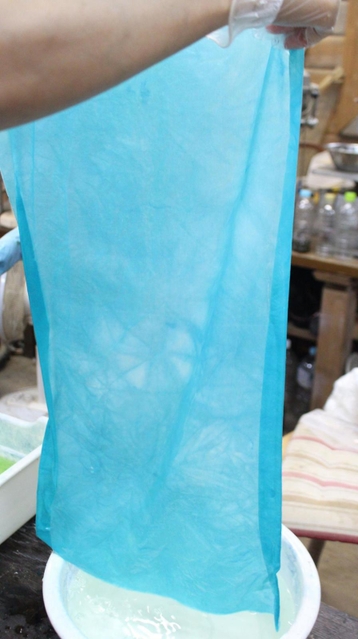 空気に触れるたびに色の濃さが増し、鮮やかな水色になった=三田市藍本