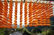 かやぶき民家は園内の福島大池を臨む場所にあり、朝晩の冷たい風が通りやすく、干し柿づくりにも適した環境という。「毎年この景色を楽しみにしてくれている人もいる」と同会の井上久雄会長(76)=尼寺。12月初旬までつるす予定としている。