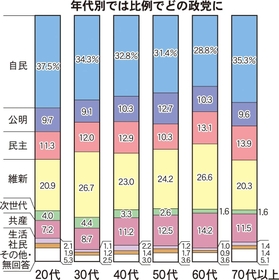 衆院選の比例の投票先について、神戸新聞社が兵庫県内で実施した出口調査によると、年代や性別を問わず、自民がトップ、維新が2位となった。