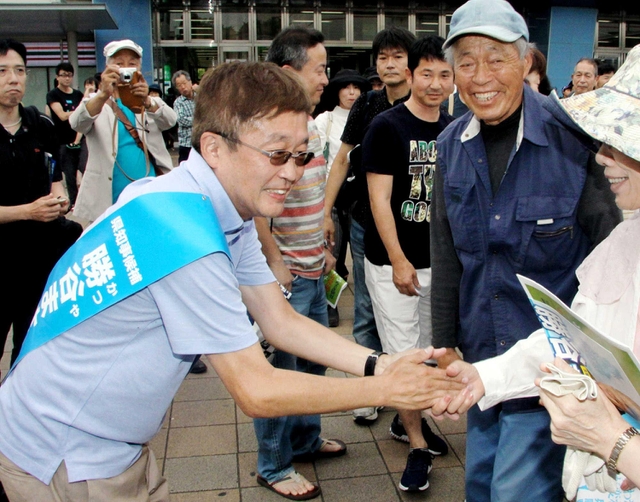 • 選挙カーに乗り込み、支援者からの呼び掛けに笑顔で応じる勝谷誠彦氏=神戸市内(撮影・大山伸一郎)
