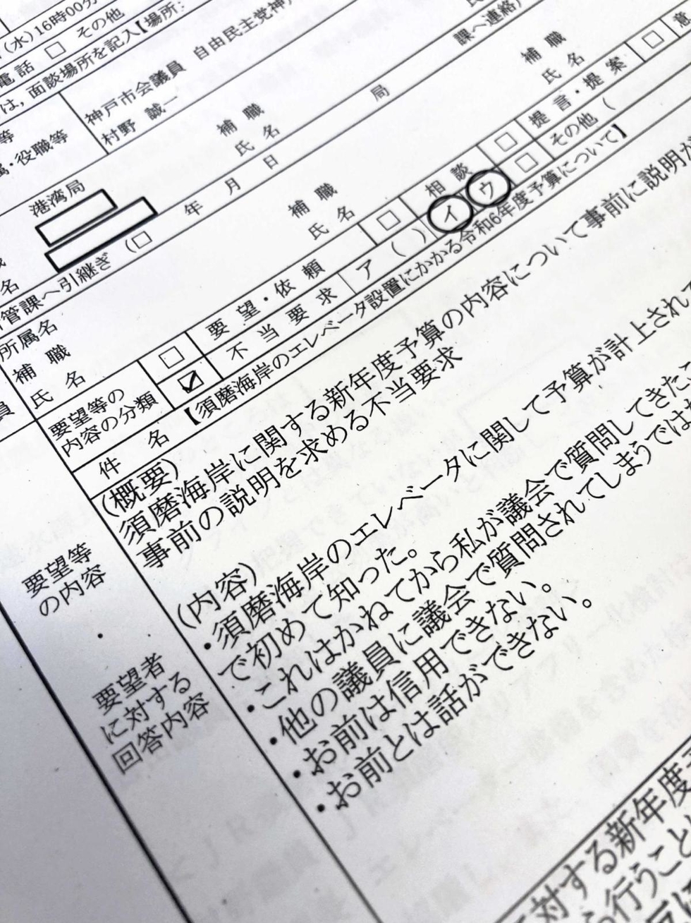 「お前は信用できない」神戸市議、職員に威圧的な言動 市「不当要求」と認定 公職者は初 2024/8/22 05:00 印刷 社会 神戸 地方行政 村野誠一神戸市議の要望を不当要求として記録した市の公文書 記事へ戻る 関連記事 告発文書、内部調査の詳細明かさず 斎藤知事、既に「真実相当性ない」と説明 整合性問われる 「不当要求」とされた神戸市議の言動とは 「選挙で選ばれた」立場強調、執拗に叱責 神戸市議に異例の「不当要求」認定 背景に対立避けたい職員心理、垣間見える力関係 議員って「センセイ」なの? アンケートで浮かび上がった当事者側の意識 6250万円で新築の相撲場、市議要望で予算増額も使われず1年 未だ活用法示されず 関連記事 告発文書、内部調査の詳細明かさず 斎藤知事、既に「真実相当性ない」と説明 整合性問われる 「不当要求」とされた神戸市議の言動とは 「選挙で選ばれた」立場強調、執拗に叱責 神戸市議に異例の「不当要求」認定 背景に対立避けたい職員心理、垣間見える力関係 議員って「センセイ」なの? アンケートで浮かび上がった当事者側の意識 6250万円で新築の相撲場、市議要望で予算増額も使われず1年 未だ活用法示されず きょうの注目記事 神戸市長選、問われる人口減対策 「150万都市」25年後に推計人口2割減 10/23 05:30 社会 神戸市長選 選挙 小中学校再編統合「速やかに進める」 廃校舎解体せず費用圧縮 三田市財政ロードマップ案 10/23 05:30 三田 地方行政 子育て 教育 廃食用油を航空機燃料に 加古川市がノウハウ持つ企業と連携協定 市内に回収ボックス設置へ 10/23 05:30 東播 地方行政 三木の農に触れ課題や魅力学ぶ 甲南大生がフィールドワーク 山田錦の生産者から聞き取り 10/23 05:30 三木 斎藤知事の給与減額案、再び継続審議決定 知事答弁に議長が異例の苦言も 兵庫県議会 10/22 20:45 社会 再負託 斎藤県政 たつの市長選 立候補者2人の主張や横顔紹介 趣味や特技、素顔にも迫る 26日投開票 10/23 05:30 西播 選挙 佐用町長選 12年ぶりの選挙戦、候補者3人の主張や横顔を紹介 26日投開票 10/23 05:30 西播 選挙 新温泉町長選 立候補者4人の主張や横顔を紹介 26日投開票 10/23 05:30 但馬 選挙 ヴィッセル神戸、江原に敗戦でACLE初黒星 3-4で競り負け 1次リーグ 10/22 22:10 スポーツ ヴィッセル <ロッカールーム>小所帯、意地のタッチダウン 仁川高アメフト部・花木聡ヘッドコーチ 10/23 05:30 スポーツ 高校スポーツ 仁川学院高校 「前泊」は視察並みの詳報提出を義務化 政活費不適切支出で手引き改訂 県議会 10/22 19:30 社会 自民、N党議員と会派結成「経緯の説明を」 自民兵庫県議団、参院会長に意見書提出へ 10/22 20:03 社会 きょうの注目記事 神戸市長選、問われる人口減対策 「150万都市」25年後に推計人口2割減 10/23 05:30 社会 神戸市長選 選挙 小中学校再編統合「速やかに進める」 廃校舎解体せず費用圧縮 三田市財政ロードマップ案 10/23 05:30 三田 地方行政 子育て 教育 廃食用油を航空機燃料に 加古川市がノウハウ持つ企業と連携協定 市内に回収ボックス設置へ 10/23 05:30 東播 地方行政 三木の農に触れ課題や魅力学ぶ 甲南大生がフィールドワーク 山田錦の生産者から聞き取り 10/23 05:30 三木 斎藤知事の給与減額案、再び継続審議決定 知事答弁に議長が異例の苦言も 兵庫県議会 10/22 20:45 社会 再負託 斎藤県政 たつの市長選 立候補者2人の主張や横顔紹介 趣味や特技、素顔にも迫る 26日投開票 10/23 05:30 西播 選挙 佐用町長選 12年ぶりの選挙戦、候補者3人の主張や横顔を紹介 26日投開票 10/23 05:30 西播 選挙 新温泉町長選 立候補者4人の主張や横顔を紹介 26日投開票 10/23 05:30 但馬 選挙 ヴィッセル神戸、江原に敗戦でACLE初黒星 3-4で競り負け 1次リーグ 10/22 22:10 スポーツ ヴィッセル <ロッカールーム>小所帯、意地のタッチダウン 仁川高アメフト部・花木聡ヘッドコーチ 10/23 05:30 スポーツ 高校スポーツ 仁川学院高校 「前泊」は視察並みの詳報提出を義務化 政活費不適切支出で手引き改訂 県議会 10/22 19:30 社会 自民、N党議員と会派結成「経緯の説明を」 自民兵庫県議団、参院会長に意見書提出へ 10/22 20:03 社会 社会新着ニュース 社会新着ニュース