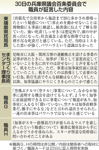 30日の百条委員会では「出張先で公用車を降りて20メートル歩かされ、職員を怒鳴り散らした」といった斎藤元彦知事のパワハラ疑惑について職員の側も証言した。「理不尽な叱責を受けたとの思いがある。社会通念上、必要な範囲とは思わない」などの訴えが相次いだ。