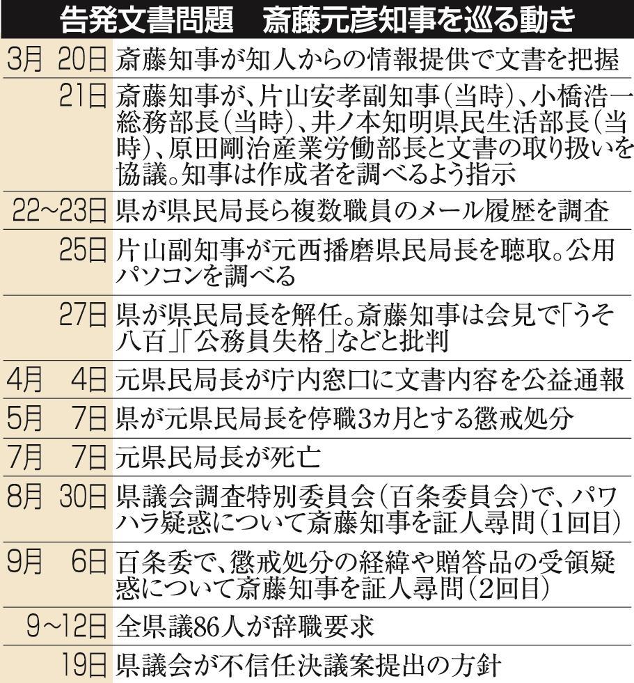 斎藤知事の不信任案、19日可決見通し 議会解散か失職か、10日以内の判断焦点に 2024/9/18 17:20 印刷 社会 揺れる県政 地方行政 神戸新聞NEXT 記事へ戻る 関連記事 【図表】不信任決議案が提出、可決されたら… 【図表】告発文書問題で、斎藤知事を巡る動きの経緯 斎藤知事の不信任案、19日可決見通し 議会解散か失職か、10日以内の判断焦点に 斎藤知事「改革止めるわけにはいかない」 公用車変更や県立大の無償など実績を強調 斎藤知事に対する不信任決議案 兵庫県議会の全86議員が定例会初日に共同提出 関連記事 【図表】不信任決議案が提出、可決されたら… 【図表】告発文書問題で、斎藤知事を巡る動きの経緯 斎藤知事の不信任案、19日可決見通し 議会解散か失職か、10日以内の判断焦点に 斎藤知事「改革止めるわけにはいかない」 公用車変更や県立大の無償など実績を強調 斎藤知事に対する不信任決議案 兵庫県議会の全86議員が定例会初日に共同提出 きょうの注目記事 阪神・淡路大震災31年 1.17追悼行事が最少37件の見通し 市民団体「風化の兆し感じる」 12/19 05:30 ウクライナの戦禍伝える万博展示品、神院大に譲渡 戦場で使われた兵士のヘルメットも 12/19 05:30 明石市がデジタル商品券「タコペイ」再販売へ 市内店舗で使用可能 水道基本料金も免除 12/19 05:30 フィギュア三原舞依が今季限りで引退 22年GPファイナル覇者 同門の坂本花織に続き表明 12/18 20:55 兵庫県マロニエ賞に48人14団体 神戸弘陵高女子硬式野球部や彩星工科高男子バドミントン部【名簿あり】 12/19 05:30 陸自第3師団長・南川陸将が着任「災害派遣、実力を高める」 伊丹 12/19 05:30 サッカー・神戸ユース、悲願の日本一へ「攻撃的なスタイル貫く」 21日高円宮杯U-18ファイナル 12/19 05:30 尼崎脱線事故の車両保存施設完成、JR西社長「感慨深い」 発生20年「事故の重さ改めて感じる」 12/19 05:30 「はばタンPay+」子育て応援枠申請、前回から1万世帯下回る 個人情報漏えいが影響か 兵庫県 12/18 17:15 宝塚市が商品券3千円分を配布へ 物価高対策で4月以降 65歳以上、住民税非課税世帯は加算 12/18 20:15 川西市がおこめ券配布と水道基本料金免除を発表 国の臨時交付金で物価高対策 12/18 14:50 芦屋市、キャッシュレス決済で20%還元へ 物価高対策で来年2月、市内1400店舗対象 12/18 17:30 きょうの注目記事 阪神・淡路大震災31年 1.17追悼行事が最少37件の見通し 市民団体「風化の兆し感じる」 12/19 05:30 ウクライナの戦禍伝える万博展示品、神院大に譲渡 戦場で使われた兵士のヘルメットも 12/19 05:30 明石市がデジタル商品券「タコペイ」再販売へ 市内店舗で使用可能 水道基本料金も免除 12/19 05:30 フィギュア三原舞依が今季限りで引退 22年GPファイナル覇者 同門の坂本花織に続き表明 12/18 20:55 兵庫県マロニエ賞に48人14団体 神戸弘陵高女子硬式野球部や彩星工科高男子バドミントン部【名簿あり】 12/19 05:30 陸自第3師団長・南川陸将が着任「災害派遣、実力を高める」 伊丹 12/19 05:30 サッカー・神戸ユース、悲願の日本一へ「攻撃的なスタイル貫く」 21日高円宮杯U-18ファイナル 12/19 05:30 尼崎脱線事故の車両保存施設完成、JR西社長「感慨深い」 発生20年「事故の重さ改めて感じる」 12/19 05:30 「はばタンPay+」子育て応援枠申請、前回から1万世帯下回る 個人情報漏えいが影響か 兵庫県 12/18 17:15 宝塚市が商品券3千円分を配布へ 物価高対策で4月以降 65歳以上、住民税非課税世帯は加算 12/18 20:15 川西市がおこめ券配布と水道基本料金免除を発表 国の臨時交付金で物価高対策 12/18 14:50 芦屋市、キャッシュレス決済で20%還元へ 物価高対策で来年2月、市内1400店舗対象 12/18 17:30 社会新着ニュース 社会新着ニュース