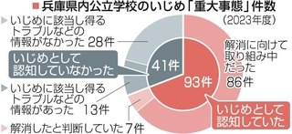 兵庫県や県教育委員会のいじめ防止策について有識者や学校関係者が議論する「県いじめ対策審議会」が県学校厚生会館(神戸市中央区)で開かれた。いじめが要因で心身に重大な被害が及んだり不登校になったりした「重大事態」は2023年度に県内の公立学校で134件発生し、うち約3割はいじめとして認知できていなかったことを県教委が公表。重大事態へと発展させないための手だてやいじめの未然防止などの在り方について議論した。