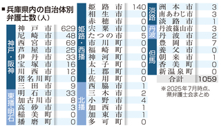 全国的に見れば東京に一極集中しているが、地方でも偏在は顕著だ。県内では神戸・阪神間などの瀬戸内側に集中し、中北部は過疎状態となっている。県弁護士会によると、県内で登録する弁護士1059人(7月時点)のうち、神戸市が629人、姫路市は140人などで、但馬や西播地域など16市町はゼロだった。
