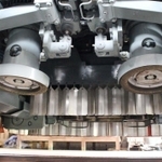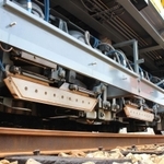 新型のレール削正車床下の砥石=姫路市花田町一本松、姫路新幹線保守基地