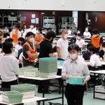 開票トラブルを受け、票を数え直す市職員ら=西宮市中央体育館
