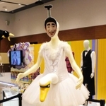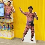 「変なおじさん」の衣装と写真パネル=大阪市中央区