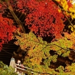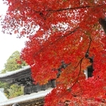 書写山円教寺大講堂前で真っ赤に色付いたモミジ=姫路市書写