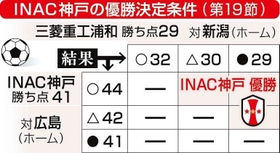 サッカー女子プロ、Yogibo WEリーグで首位を独走するINAC神戸(勝ち点41)は第19節第1日の29日、神戸市兵庫区のノエビアスタジアム神戸で8位広島(同15)を迎え撃つ。この試合に勝ち、2位三菱重工浦和(同29)が引き分け以下なら、INACの初代女王が決定。INACが引き分けても、浦和が敗れると優勝が決まる。