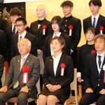神戸市のスポーツ優秀選手に選ばれ記念撮影に臨む坂本花織選手(前列右から2人目)ら=中央区中山手通5、THE SORAKUEN