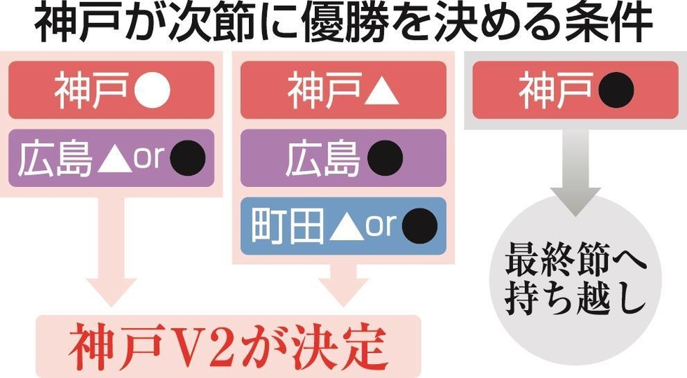 ヴィッセル神戸、最短Vは12月1日 その条件は? 残り2試合、優勝争いは3チームに 2024/11/11 13:15 印刷 スポーツ ヴィッセル ヴィッセル神戸が次節に優勝を決める条件 記事へ戻る 関連記事 イニエスタ「おめでとう、おめでとう、おめでとう」 初優勝のヴィッセル神戸にメッセージ 退団表明のイニエスタが語っていた「神戸愛」 推定年俸30億円→コロナ禍で大幅減俸受け入れた過去も 【写真】 ヴィッセル色にライトアップ メリケンパークなど神戸の14カ所 前回優勝時 ヴィッセルOB槙野さん、12月に神戸で引退試合 神戸の現役やOB選手らのチームと対戦 「一緒にカフェを」ヴィッセル神戸・酒井選手の弟経営、サポーターら通う人気店「人と人つなぐ場に」 関連記事 イニエスタ「おめでとう、おめでとう、おめでとう」 初優勝のヴィッセル神戸にメッセージ 退団表明のイニエスタが語っていた「神戸愛」 推定年俸30億円→コロナ禍で大幅減俸受け入れた過去も 【写真】 ヴィッセル色にライトアップ メリケンパークなど神戸の14カ所 前回優勝時 ヴィッセルOB槙野さん、12月に神戸で引退試合 神戸の現役やOB選手らのチームと対戦 「一緒にカフェを」ヴィッセル神戸・酒井選手の弟経営、サポーターら通う人気店「人と人つなぐ場に」 きょうの注目記事 【更新】神戸市長選が告示 4氏の選挙戦確定 26日に投開票 10/12 19:05 社会 神戸市長選 選挙 神戸 神戸市長選告示、4候補が第一声 まちの再整備や物価高対策など主張 10/12 19:00 社会 神戸市長選 選挙 神戸 関学大の合格最多は須磨学園 早稲田大は灘 10/12 05:58 秋の浜辺、男衆が勇壮の舞 赤穂・坂越の船祭、神事「バタカケ」披露 10/12 18:05 社会 西播 秋祭り 伝統の「宇原獅子舞」、全12演目を披露 宍粟・岩田神社で秋季大祭 10/12 17:15 西播 秋祭り 将棋「第15期加古川青流戦」決勝3番勝負が開幕 吉池四段が先勝 10/12 19:20 文化 囲碁将棋 東播 神戸ストークス、奈良破り開幕4連勝 西地区唯一 バスケBリーグ2部 10/12 20:01 スポーツ ストークス <わが心の自叙伝 上沼恵美子>(1)古希を迎えて 10/11 23:00 わが心の自叙伝 動画ニュース 万博関連イベント「楽市楽座」一足早く幕 10/12 20:05 社会 万博 阪神 虎リーグV、今年も中継はサンテレビ CSファイナルも中継か 村上アナ「しびれる試合期待」 10/12 05:30 社会 タイガース 松竹新喜劇の正月公演、舞台は2年連続淡路島 藤山寛美の十八番「ふる里の橋」、戸田ルナさんら盛況祈願 10/12 05:30 淡路 民家で住人男性が刃物で切られ死亡 殺人未遂疑いで女逮捕 尼崎 10/12 20:24 事件・事故 きょうの注目記事 【更新】神戸市長選が告示 4氏の選挙戦確定 26日に投開票 10/12 19:05 社会 神戸市長選 選挙 神戸 神戸市長選告示、4候補が第一声 まちの再整備や物価高対策など主張 10/12 19:00 社会 神戸市長選 選挙 神戸 関学大の合格最多は須磨学園 早稲田大は灘 10/12 05:58 秋の浜辺、男衆が勇壮の舞 赤穂・坂越の船祭、神事「バタカケ」披露 10/12 18:05 社会 西播 秋祭り 伝統の「宇原獅子舞」、全12演目を披露 宍粟・岩田神社で秋季大祭 10/12 17:15 西播 秋祭り 将棋「第15期加古川青流戦」決勝3番勝負が開幕 吉池四段が先勝 10/12 19:20 文化 囲碁将棋 東播 神戸ストークス、奈良破り開幕4連勝 西地区唯一 バスケBリーグ2部 10/12 20:01 スポーツ ストークス <わが心の自叙伝 上沼恵美子>(1)古希を迎えて 10/11 23:00 わが心の自叙伝 動画ニュース 万博関連イベント「楽市楽座」一足早く幕 10/12 20:05 社会 万博 阪神 虎リーグV、今年も中継はサンテレビ CSファイナルも中継か 村上アナ「しびれる試合期待」 10/12 05:30 社会 タイガース 松竹新喜劇の正月公演、舞台は2年連続淡路島 藤山寛美の十八番「ふる里の橋」、戸田ルナさんら盛況祈願 10/12 05:30 淡路 民家で住人男性が刃物で切られ死亡 殺人未遂疑いで女逮捕 尼崎 10/12 20:24 事件・事故 スポーツ新着ニュース スポーツ新着ニュース