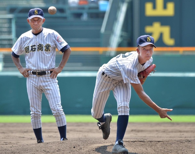 狭間監督に見守られながらマウンドで投球を確かめる宮口(撮影・秋山亮太)