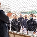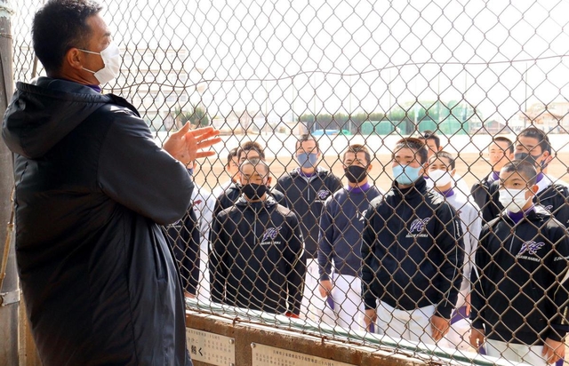 部員を前にベンチ入りメンバーの候補者を発表する福村順一監督(左端)=東播磨高校