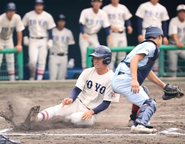 近大新宮-東洋大姫路 7回裏東洋大姫路2死二塁、実光の適時打で小橋が生還し2-0とリードを広げる=奈良県さとやくスタジアム(撮影・吉田敦史)