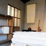森田さんが栽培している和綿を使った布団やストール=丹波篠山市安口