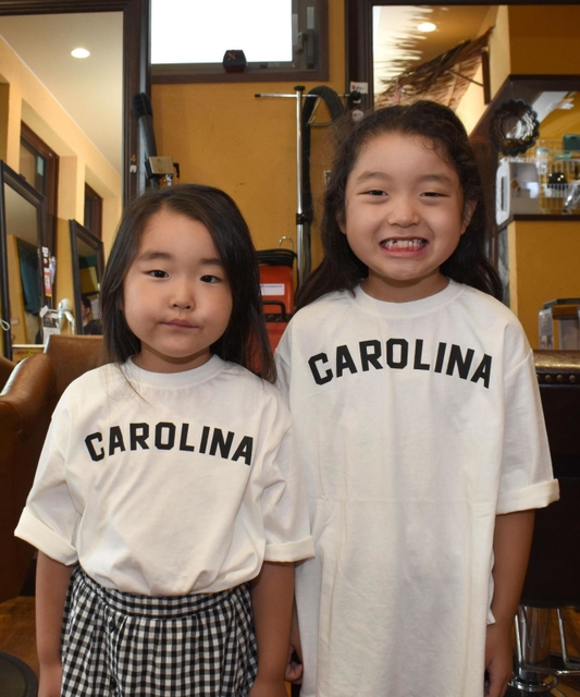 • 腰まで伸びた山田陽生君(右)と和花ちゃんの髪=加古川市加古川町北在家