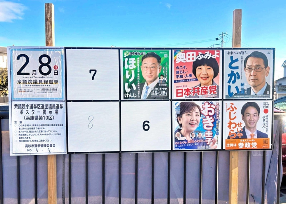 衆院選・兵庫10区 大物ら来援や自転車遊説、ネット配信… 5候補、声からし訴え 2026/2/6 05:30 印刷 東播 衆院選26 材質の異なる板を使い、数字が手書きされるなど、急ごしらえだったことが伺えるポスター掲示板=高砂市荒井町千鳥3 記事へ戻る 関連記事 衆院選投開票日、兵庫で警報級の大雪か 養父、朝来、宍粟など5市町で投票時間短縮 サナ活、#おじ活…「推し活」で衆院選にうねりを SNS拡散に各党躍起 識者警鐘「政策論が置き去り」 衆院選・兵庫9区 子育てや移住促進、漁業活性化…課題解決の「処方箋」は 淡路島の有権者に聞く 衆院選・兵庫11、12区 広い選挙区を東奔西走 真冬の選挙戦に各陣営が工夫や対策 衆院選・兵庫4区 「2万の公明票」の動向に注目 自民前職と中道新人、共産新人が議席争う 関連記事 衆院選投開票日、兵庫で警報級の大雪か 養父、朝来、宍粟など5市町で投票時間短縮 サナ活、#おじ活…「推し活」で衆院選にうねりを SNS拡散に各党躍起 識者警鐘「政策論が置き去り」 衆院選・兵庫9区 子育てや移住促進、漁業活性化…課題解決の「処方箋」は 淡路島の有権者に聞く 衆院選・兵庫11、12区 広い選挙区を東奔西走 真冬の選挙戦に各陣営が工夫や対策 衆院選・兵庫4区 「2万の公明票」の動向に注目 自民前職と中道新人、共産新人が議席争う きょうの注目記事 サナ活、#おじ活…「推し活」で衆院選にうねりを SNS拡散に各党躍起 2/6 05:30 社会 衆院選26 遠隔操作技術で共生社会実現へ ロボット学者・石黒氏が登壇 2/6 05:30 経済 衆院選投開票日、兵庫で警報級の大雪か 2/6 05:30 社会 衆院選26 ヴィッセル、6日に京都戦 山川主将「アグレッシブなサッカーを」 2/6 05:30 スポーツ ヴィッセル ケンミン食品、冷凍ビーフン人気定着 自販機で10万パック販売 2/6 05:30 丹波 グルメ 持続可能な未来社会へ経営者らが課題議論 関西財界セミナー 2/6 05:30 経済 万博 衆院選・兵庫8区 公明「牙城」撤退、構図が流動化 2/6 05:30 阪神 衆院選26 衆院選・兵庫4区 「2万の公明票」の動向に注目 2/6 05:30 北播 三木 神戸 衆院選26 歴史の縁感じる新たな幼稚園 「おの幼稚園」で竣工式 2/6 05:30 北播 子育て 兵庫県の公立高入試出願状況 推薦1.23倍、特色選抜1.14倍 2/5 18:17 社会 教育 高校受験 大阪府の私立高入試出願、平均倍率2.53倍 26年度 2/5 17:30 社会 教育 高校受験 多可の新中学校、バスロータリー予定地で有害物質検出 2/5 19:30 北播 きょうの注目記事 サナ活、#おじ活…「推し活」で衆院選にうねりを SNS拡散に各党躍起 2/6 05:30 社会 衆院選26 遠隔操作技術で共生社会実現へ ロボット学者・石黒氏が登壇 2/6 05:30 経済 衆院選投開票日、兵庫で警報級の大雪か 2/6 05:30 社会 衆院選26 ヴィッセル、6日に京都戦 山川主将「アグレッシブなサッカーを」 2/6 05:30 スポーツ ヴィッセル ケンミン食品、冷凍ビーフン人気定着 自販機で10万パック販売 2/6 05:30 丹波 グルメ 持続可能な未来社会へ経営者らが課題議論 関西財界セミナー 2/6 05:30 経済 万博 衆院選・兵庫8区 公明「牙城」撤退、構図が流動化 2/6 05:30 阪神 衆院選26 衆院選・兵庫4区 「2万の公明票」の動向に注目 2/6 05:30 北播 三木 神戸 衆院選26 歴史の縁感じる新たな幼稚園 「おの幼稚園」で竣工式 2/6 05:30 北播 子育て 兵庫県の公立高入試出願状況 推薦1.23倍、特色選抜1.14倍 2/5 18:17 社会 教育 高校受験 大阪府の私立高入試出願、平均倍率2.53倍 26年度 2/5 17:30 社会 教育 高校受験 多可の新中学校、バスロータリー予定地で有害物質検出 2/5 19:30 北播 東播新着ニュース 東播新着ニュース