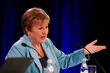 記者会見するIMFのゲオルギエワ専務理事=17日、米ワシントン(共同)